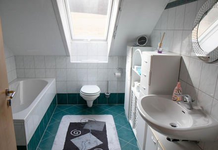 On the upper floor next to the prayer room is your bedroom and living room. Up to two people can live here. It has its own balcony. Your bathroom with toilet and your kitchen with dining area are on the same floor. Our fitness room can also be used.
